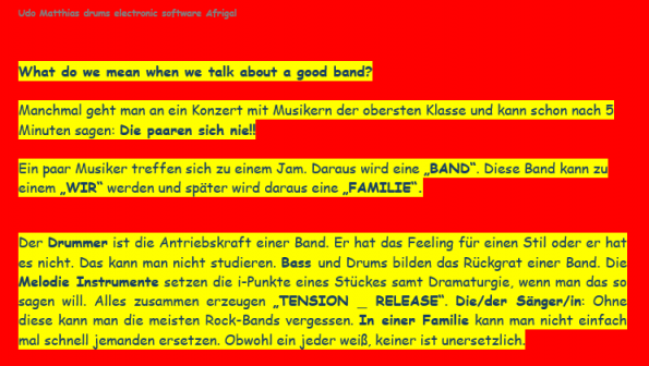 In recent years, Udo Matthias has been playing with many different names, including Chris Weller, Wilfrid Kirner, Lukas Heideprim, Axel Fischbacher, Ingmar Winkler, Peter Wagner Organ (CH), André Buser Bass (ch), Stefan Stalf (Munich), Johnny Gomer (guit), u.v.a. For several years he has been working on his own project @frigal – electronic music with African rhythms. Udo Matthias spielte in den Letzten Jahren unter immer wieder anderem Namen mit vielen verschiedenen Musikern (Chris Weller, Wilfrid Kirner, Lukas Heideprim, Axel Fischbacher, Ingmar Winkler, Peter Wagner organ (CH), André Buser bass (CH), Stefan Stalf (München), Johnny Gomer (guit), u.v.a Seit mehreren Jahren arbeitet er an seinem eigenen Projekt @frigal – elektronische Musik mit afrikanischen Rhythmen.